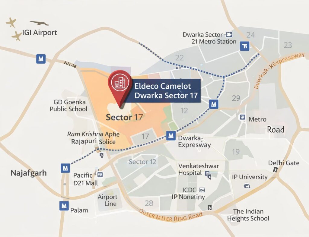 - Located in Sector 17, Dwarka, a premium and well-planned residential zone